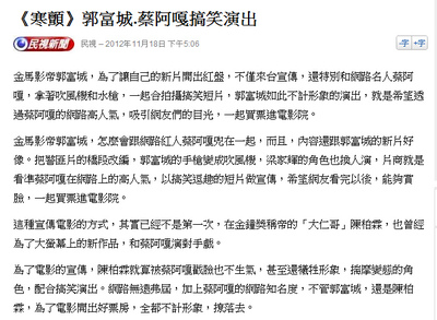 金馬影帝郭富城,為了讓自己的新片開出紅盤,不僅來台宣傳,還特別和網路名人蔡阿嘎,拿著吹風機和水槍,一起合拍攝搞笑短片,郭富城如此不計形象的演出,就是希望透過蔡阿嘎的網路高人氣,吸引網友們的目光,一起買票進電影院。