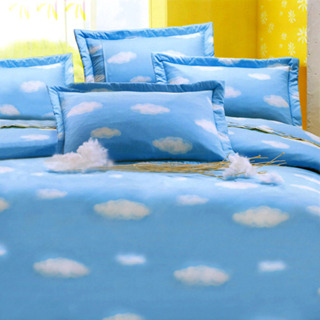 momo網母親節好禮 涼爽床墊 【藍天白雲】6.0呎x6.2呎-六件式雙人加大100%高級純棉-鋪棉床罩組(藍色) 情人