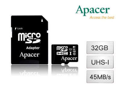 Apacer宇瞻科技新一代MicroSDHC UHS-I Class10記憶卡,最高傳輸速度達45MB/s,具備閃電般迅捷的「隨機讀取速度」,每一個操作瞬間都能敏捷讀寫、快速回應,無論是使用Facebook、拍照錄影、瀏覽相簿、上網、地圖導航或玩遊戲,都能帶來流暢無瑕的使用體驗,讓您的數位產品充分發揮功能。Apacer MicroSDHC記憶卡是您最佳選擇! Apacer MicroSDHC UHS-I Class 10 記憶卡相容於最新UHS-I介面。UHS-I 代表Ultra-High Speed Bus 1,是SDHC記憶卡新的架構設計,可讓傳輸速度最高達45MB/秒,有了Apacer MicroSDHC記憶卡, 無論是「高速連拍」或是「高畫質錄影」等,現在都能安心儲存。
