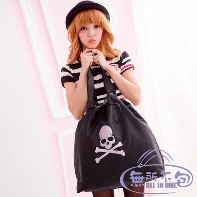 服務這麼優,當然在網路購物最好啦~~你一定要來看看【無所不包】B032-1時髦風潮*骷髏頭肩背束口托特包(個性黑)~~