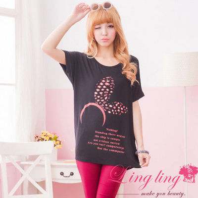 [推薦開箱]lingling中大尺碼 印圖造型短袖長版T恤(髮圈黑)A1661-03(胸圍42以內)