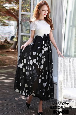 年終尾牙推薦-momo購物網推薦【KVOLL中大尺碼】白色蕾絲拼接雪紡波點長洋裝-辦年貨推薦