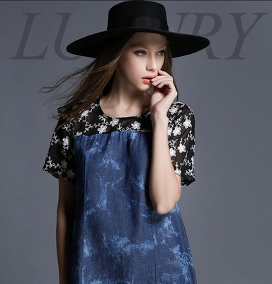 momo購物網推薦【ABELLA 艾貝拉】大碼-繡花網紗拼接水洗牛仔洋裝連衣裙(XL-5XL)