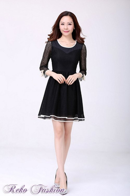 大尺碼-黑色蝴蝶結中袖蕾絲洋裝-Reko Fashion