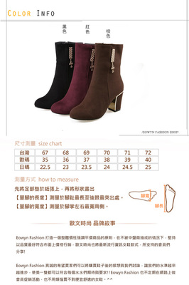 【EOWYN】歐美百搭款圓頭水鑽金屬十字垂飾造型粗跟短靴EMD03064-75(3色-34-39碼現貨+預購) 女鞋尺寸對照