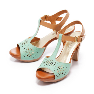 Fair Lady T字型繫帶雕花魚口粗跟鞋 綠