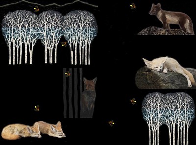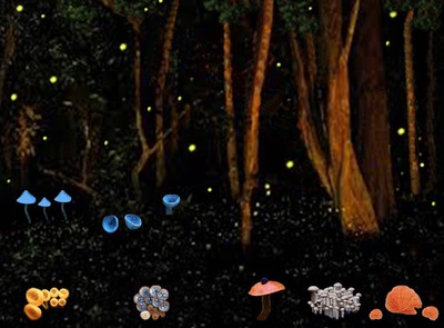 森林 覆蓋著夜燈 無盡的驚喜 閃閃 交流 星光與螢火 伴隨晚風飛