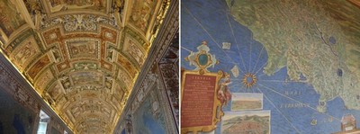 穿過 地圖長廊 仰望金碧輝煌 拱頂壁畫 描繪 舊約的獻祭人物 新約的聖徒神跡 連同 抽象概念 勇氣與憐憫 具象化為入物 雕刻鑲...