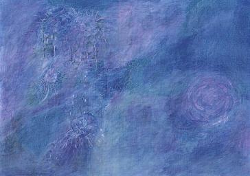 為什麼我無法畫『壓克力平塗畫』呢?我一遍又一遍的問鏡子,鏡子的回答越來越玄奧,一直到我畫出一個超級漩渦,把自己狠狠吞噬了,依然找不到答案,那夾在鏡中和躲在鏡背後的我以及我的影子,依然不斷分裂-分裂-分裂-,紫色的鏡面也越來越沉默,唉,也許『鏡說』這命題是犯忌的,就像生命本身永遠無法靠壓克力顏料來平塗一樣!