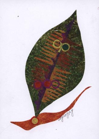 另一片在風中旅行的葉子告訴我:音符的翅膀之所以完全透明,是為了穿梭一切時空,夢的色彩之所以虛無,是為了隨時可以變換著色﹔我說:是的,我之所以要具體捕捉描繪它們,是為了在離開家之前,可以把自己變成一片透明的葉子,隨風自在的四處旅行!