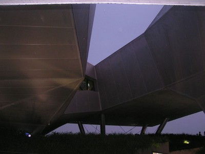 一座以四個不規則的幾何圖形構成的建築物,延伸著銀白色的身軀,坐落在綠色植物與木頭走道中。它是德國館,兼具穩重與輕盈的元素,讓人站立於地面的同時,燃起飛翔的快感。德國館分為外場與內場,走道與植物的範圍屬於外場,樸素的氣氛讓人無法預料到在主建築中會遇見另一種截然不同的景像。以「銀白色發光建築膜」包覆的外牆似乎暗示了此點:在特定的角度、光線下,牆身會變得透明可見,一部分展品亦因此隱約浮現。此時,展品在建築膜的過濾下仍顯得樸素、靜謐,直到入館後,遊客才能看見它外露的耀眼光芒。