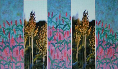 完成詩作之後,我開始在畫裡種高粱,種到三更半夜,越種越多,累得眼睛快睜不開了,卻捨不得離開一片金黃、結穗纍纍的高粱田。那一行行一列列的高粱,越種越有感情,形成一大片金黃澄透的豐收景色,讓我深深迷戀。我每多種一行高粱,感覺田地可利用的空間變小了,土地便對我深情呼喚,讓我立即找到空隙,再種下一棵、接著又種下一棵。不眠的夜,我數了數佔滿一片畫作土地的高粱,已經一百多棵了,我發現仍有空間,可以再種一棵。彷彿畫裡的土地是有魔法的,為了擁有更多的高粱來釀造美酒,它自動擴伸版圖,引誘我一直栽種。一片豐收的土地,我先用三種顏色的暖黃色塊拼貼出高粱穗,再用細筆描繪一顆一顆飽滿的穀粒,那細瘦的高粱桿和細長的葉子,為了呈現它們與陽光相輝映的生命色澤,我使用各種不同層次的綠色拼貼,然後將細瘦桿子、飽滿的高粱穗和細長葉子逐一拼貼組合,讓一棵一棵高粱在風中優美的搖曳,散發魔幻的香氣。
