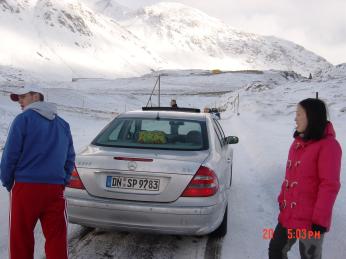 (圖:被困在大雪中動彈不得的車子、及不知所措的大家)(左邊是Paul,來自密西根,超級不怕冷,看他穿那麼少就知道了;右邊是Chodura,西伯利亞人,就是包包不見的那位俄國女生;遠方有一輛黑色的車就是BMW wagen)