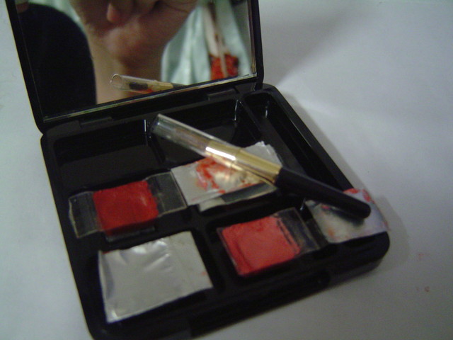 懶得把口紅挖出來再填進去,直接剪開試用的口紅,在盒子底貼上雙面膠黏進去,下次用完拔掉舊的再黏新的進去。附贈的小口紅刷很難用,就~拿走開。