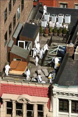 波士頓爆炸案調查工作持續進行,蒐證人員在爆炸案現場旁屋頂蒐證。(法新社)波士頓炸彈犯 FBI鎖定兩嫌http://www.libertytimes.com.tw/2013/new/apr/19/tod...