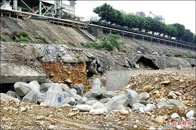 三河局在大甲溪舊社堤防施工處填補消波塊。(記者張軒哲攝)修堤填消波塊 后里居民憂心http://www.libertytimes.com.tw/2013/new/apr/14/today-cente...