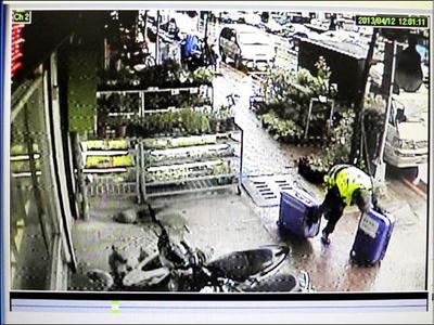 歹徒將爆裂物放置服務處前,犯案廂型車就停放路邊,推得太快,險些摔倒。(記者吳仁捷翻攝)行李炸彈摻硝酸銨 仿美汽車炸彈案http://www.libertytimes.com.tw/2013/new/...