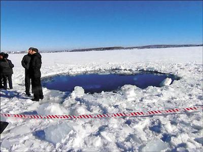 一顆巨大隕石飛過車里亞賓斯克上空,調查人員站在一座結冰的湖泊上,旁邊的大洞疑似是被隕石碎片所炸開。(歐新社)隕石撞俄羅斯 上千人受傷http://www.libertytimes.com.tw/201...