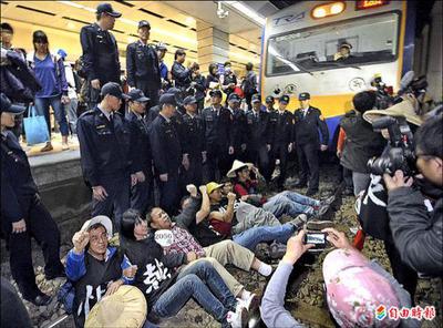 全國關廠工人連線昨日結束在勞委會前抗議後轉往台北火車站,在等不到勞委會主委潘世偉的回應後,關廠勞工跳下軌道阻擋列車進站。(記者王敏為攝)關廠工人連線 抗議政府逼債/上百勞工臥軌 http://www....