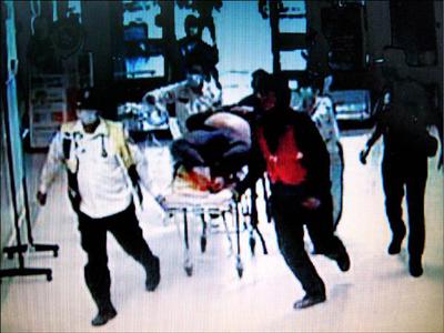 除鏽噴漆工人全身氣腫昏迷,人躺在擔架送進醫院急診處,全身腫脹如發胖的體型。(記者張聰秋翻攝)一屁股跌坐噴槍 灌...