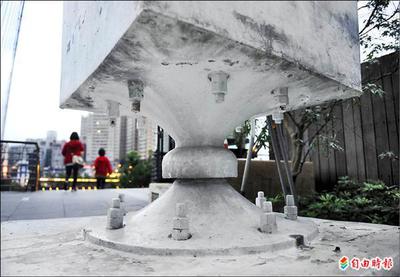 碧潭吊橋因新北市政府都更案,面臨拆除的命運,百年吊橋恐將走入歷史。圖為都更地所在位置的東岸橋頭橋墩。(記者羅沛...
