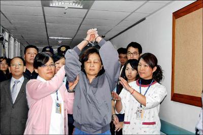 雲林縣長蘇治芬因璟美案被控收賄,最高法院昨判決蘇無罪定讞。圖為當時蘇治芬(中)因絕食戒護就醫,高舉雙手抗...