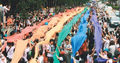 第六屆台灣同志遊行上月27日在台北市政府前廣場舉辦,參加遊行的同志,還舉起彩虹旗形成「超級動態大彩虹」。