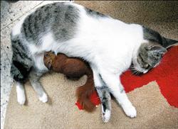 住在哥倫比亞艾維加多市的母貓「蒂塔」餵奶給一隻小松鼠喝。這隻小松鼠是蒂塔的飼主嘉維里亞日前在公園裡發現的,當時小松鼠受了傷,嘉維里亞就把牠帶回家照顧,由蒂塔充當起奶媽的角色,貓鼠一家親。(路透)