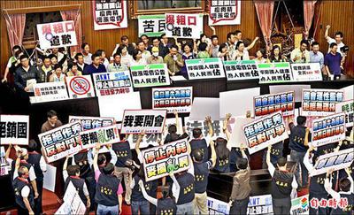 立法院朝野因瘦肉精美牛修法案僵持不下,昨天傍晚休會前,占領主席台的在野立委與台下國民黨立委各自以標語、口號表達立場,雙方一番叫陣後,結束本會期。府院黨稍晚會商後決定,要求召開立院臨時會,並續推美牛修法案。(記者羅沛德攝)