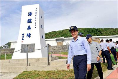 總統馬英九(前)昨天率媒體登彭佳嶼並發表談話,宣示釣魚台主權。二○○五年八月間,當時的陳水扁總統曾登島主持「海疆屏障」揭碑儀式。(中央社)