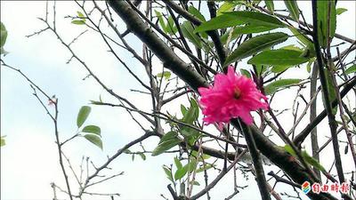 宜蘭市「公館圳」兩旁栽種的山櫻花,有好幾棵竟然在最近的大熱天開花,專家說,這可能是植物本身的養分吸取情況及外在環境變化所影響。(記者胡健森攝