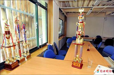 今年5、6月,當各地陸續傳出門市付不出房租時,總公司竟還號召全國業務舉辦夏季競賽,拚出1.2億投資額。圖為紅景天北區管理處辦公桌上遺留的競賽獎杯。(記者王藝菘攝)