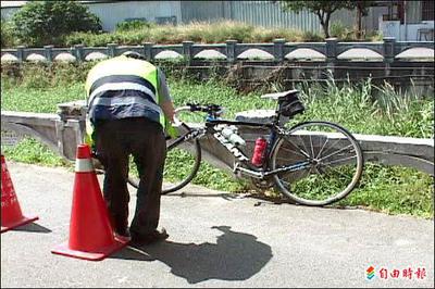 摔車造成重傷的陳仁嘉發生意外後,整部腳踏車幾乎解體,摔車程度非常嚴重。(記者蔡文正攝)