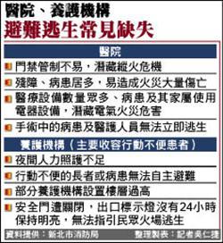 目前全台有四百一十六家護理之家、五百二十四家醫院、一百七十六家精神復健機構及二十九家精神護理之家,衛生署副署長林奏延表示已發文逾千家醫療機構,通令三天內向所在衛生局回報消防安全自我檢核結果,各地衛生局並將在一個月內會同消防單位組成聯合訪視小組,展開全面稽查,確保消防安全。