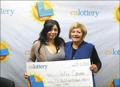 多年來靠殘障福利金過活的美國加州69歲阿嬤塞維拉,5月和女兒瑪奎茲開車回家途中,因女兒要買水喝,塞維拉順便叫女兒替她買張加州超級樂透彩彩券,結果彩券就被遺忘在車上。沒想到這張彩券中了2300萬美元(約台幣6億7000餘萬元)的頭獎,因5個月來一直沒人領,彩券官員趕在26日到期前尋找這位神秘得獎人,直到本月1日有人傳給塞維拉一張她女兒在雜貨店買這張中頭獎彩券的照片,塞維拉才發現自己差點就跟千萬富翁擦身而過。圖為塞維拉(右)和女兒2日一同公開露面領獎。(路透)