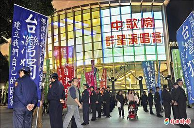 〔記者曾韋禎、王郁惠/台北報導〕中國「中歌榜群星演唱會」昨在台北小巨蛋舉行,場內是一整晚費盡心思遊走敏感地帶,刻意營造「兩岸一家親」的氛圍;場外則是獨派團體到場抗議中國進行文化統戰、矮化台灣主權。