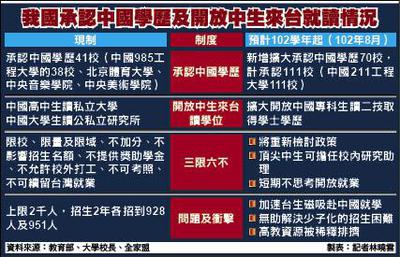 〔記者陳璟民、陳怡靜/綜合報導〕馬總統昨宣布將擴大承認中國學歷及開放中生來台讀二技,民進黨、台聯立委昨抨擊,馬政府讓私校飲鴆止渴,讓更多中生入台,隨之而來將是開放承認中國證照、中生在台工作,以及變相移民等,台灣趨向中國化,民主政治、自由經濟恐萬劫不復,全民當慎思後果嚴重,要馬政府踩煞車。