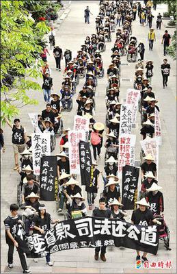 全國關廠工人連線輪椅大隊恨行活動昨日從勞委會出發,工人乘坐數十台輪椅,以行軍方式前往新北地院、桃園地院,訴求關廠工人和保人遭起訴案,要求地院併案處理。(記者廖振輝攝)