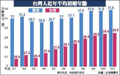 〔記者陳慧萍、邱宜君、楊久瑩/台北報導〕台灣人晚婚現象日趨嚴重,尤其是女性。內政部昨天公布統計,民國一○一年平均初婚年齡新郎卅一.九歲,新娘廿九.五歲,與民國九十一年統計數據相比,台灣男性平均初婚年齡十一年增加了○.九歲,女性更大幅增加二.七歲。