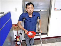 5月30日晚上8點多,患小兒麻痺症的莫男坐在台北市汀州路超商旁,他將萎縮左腳跨在頸後,支撐靠牆博取同情。