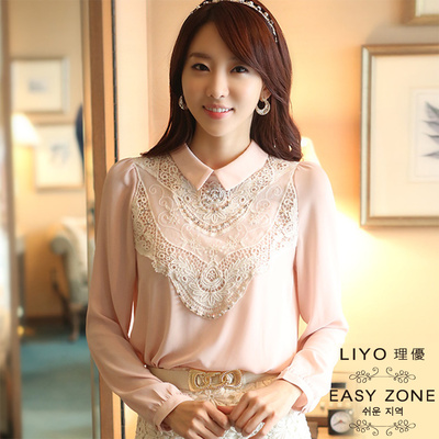 LIYO理優 法式鏤空蕾絲真珠裝飾雪紡上衣 526 S-L