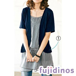 梭織布料的假二件式長版上衣。內搭為雪紡紋條印花、腰間二段蛋糕裙樣式。