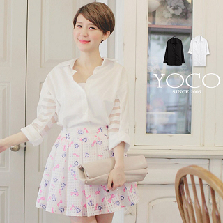 【YOCO】正韓條紋透肌紗拼接襯衫商品訊息描述: