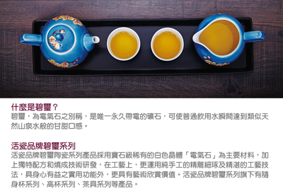 商品訊息功能: 活瓷品牌碧璽釉讓杯裡的水有如山泉水般的滑順甘甜口感