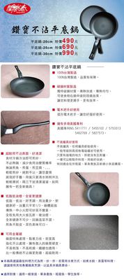 商品訊息簡述: ◆碳鋼材質製成,傳熱迅速◆電木弧形把手,舒適好握◆多項美國專利,優質商品◆絕對不挑爐具,輕鬆使用◆耐用不沾表面,超好清潔