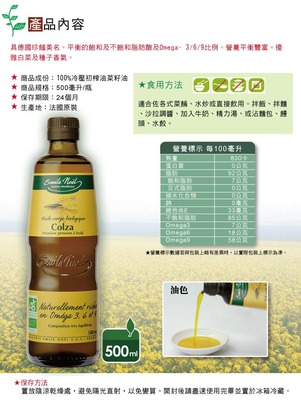 前幾天在逛街的時候看到【法國艾米爾諾耶】歐盟AB有機冷壓初榨油菜籽油(500ml) 覺得很心動而且正打算買【法國艾米爾諾耶】歐盟AB有機冷壓初榨油菜籽油(500ml)