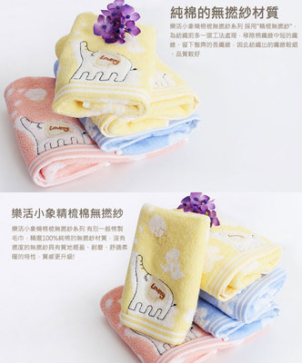 樂活小象精棉梳無撚紗系列 採抗菌性材質,擁有超強吸水介面,可輕易拭身體、頭髮去多餘的水分,柔軟不傷肌膚,細心呵護嬰幼兒嬌嫩的肌膚,為外銷日本材質,佳評如潮!