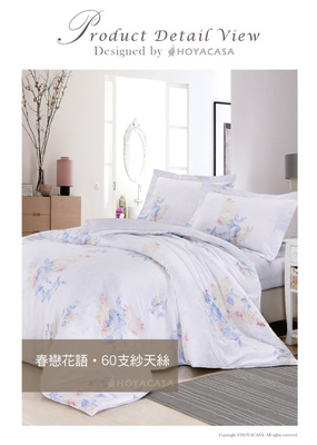 此組《HOYACASA 春戀花語》特大四件式天絲兩用被床包組,使用珍珠雅白襯底,用天絲輕柔的特性來捕捉漫舞於普羅旺斯晴空下的花妍,以線條勾勒出層次、再以手繪的方式呈現,色彩則擷取平原矢車菊藍、配上珊瑚紅,再調和柔緻粉韻,演繹春夏獨有清新色調;其透氣性及光澤度大滿分,觸感輕柔舒適,全面體貼您的肌膚,加上它透氣、吸汗的特性,讓您能安穩的一覺到天亮;不僅讓視覺得到最完美的享受,對肌膚舒適的呵護也替您想得周到。講求好品質及舒適觸感的您,絕對是您的最佳選擇。