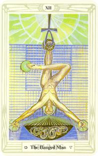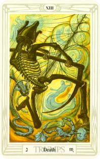 托特牌的「13」號牌對應的是死神牌,這個死神看起來很生動,一副動作活潑有律動感的骷髏,感覺很有能量;骷髏被繩子牽引,象徵著我們的生命被命運的繩子緊緊掌控。右下角的蠍子和天蠍座有關,象徵讓我們死亡的事物...