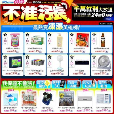 繼上回不准漲專館大受網友好評後,PChome線上購物又有抗漲新動作!不僅擴大全站規模主打『7月就是不准漲』,7/3起每日中午12點定期公布該購物網站前10大最熱賣的熱賣凍漲商品英雄榜,以供消費者參考選購。除了抗漲英雄榜之外,該活動還匯集包含3C家電、食品日用、流行保養及生活育樂等商品類,推出30個保證7月絕對不漲價的夏日暢銷商品,讓擔憂荷包大縮水的顧客們能有更多樣化的購物抗漲選擇!